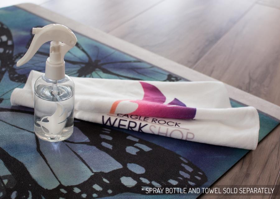 First, lightly rinse your mat with water. (No need to fully submerge it) Next, spray it with an anti-bacterial yoga mat spray. See below for an easy-breezy, awesome-smelling, and all-natural DIY cleaner that we use in the WERKSHOP studio! We’ve tested it out and it’s safe for our mats, but we recommend spot testing any new cleaner on a corner of your mat to be sure that it doesn’t affect the printing.) Gently rub the spray into the mat with your hand and then lightly rinse again. Hang the mat up to dry - it may take a day to dry, depending on what season you're in.  Voila!  Squeaky clean, happy-smelling mat!