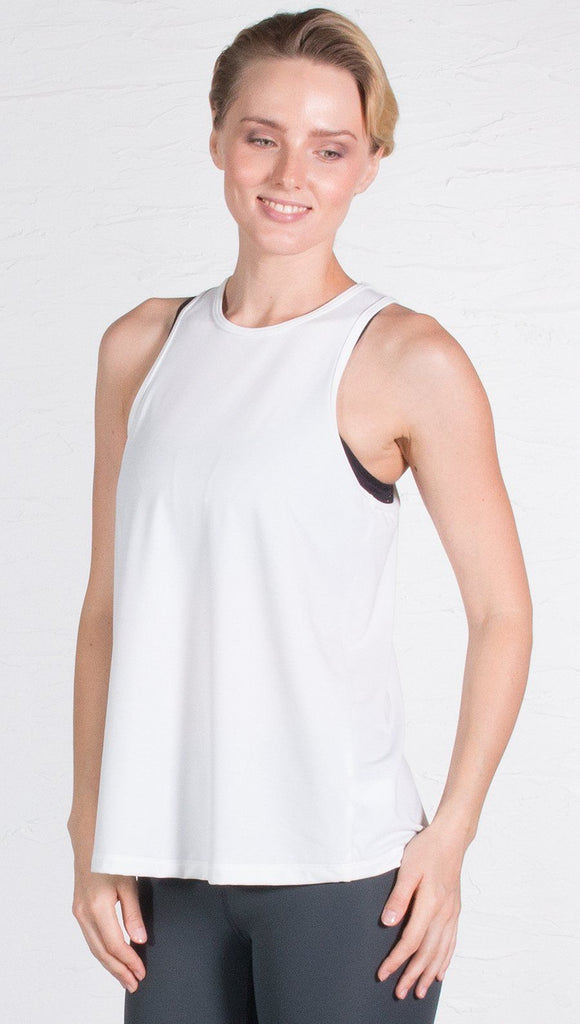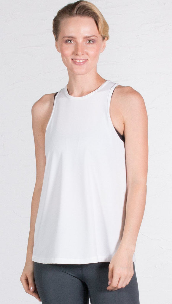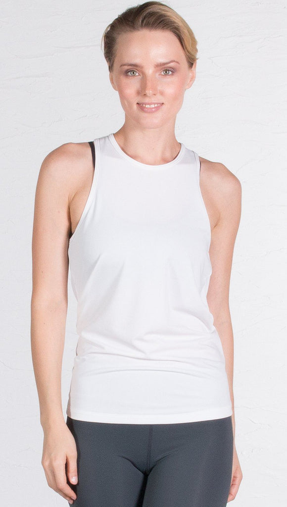 Our Tie Back Racer Tank is perfect for those indecisive days, whether it's for a class or a quick jaunt around your city. Layer it on long and loose or tie it up while werking up a sweat. ;) This amazingly soft and lightweight tank is designed to keep you cool and dry all day long. With great stretch and shape retention its the perfect piece to keep you motivated all year long!
