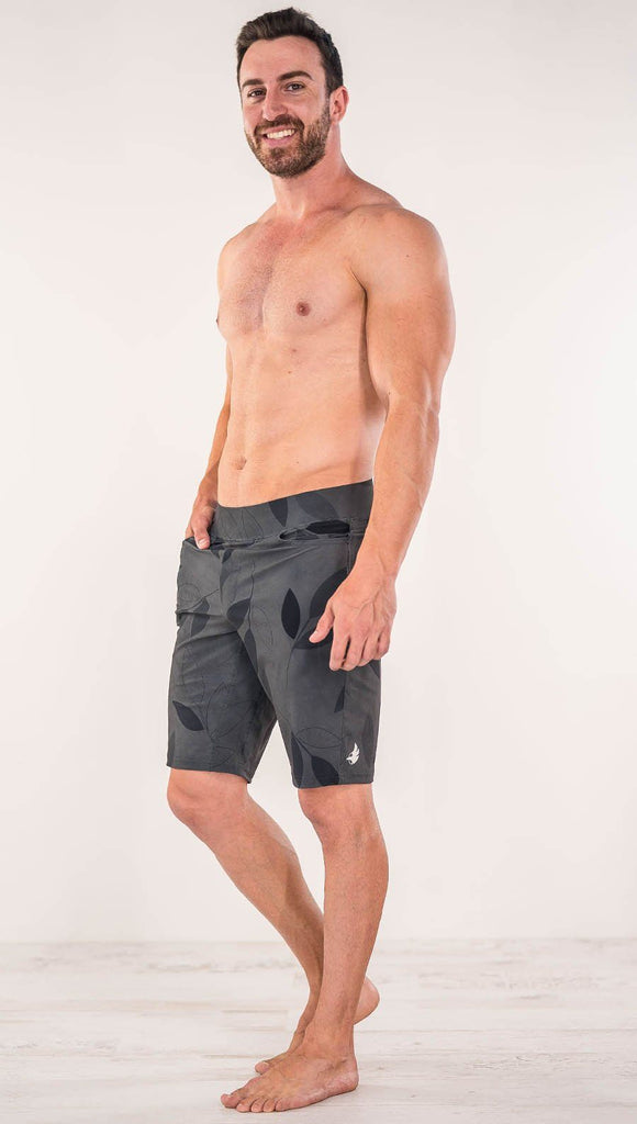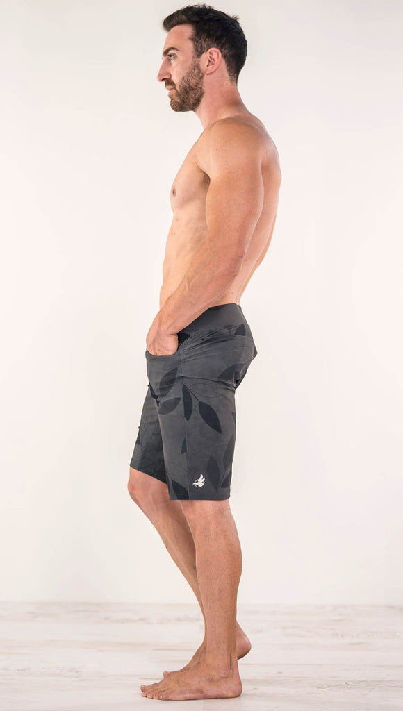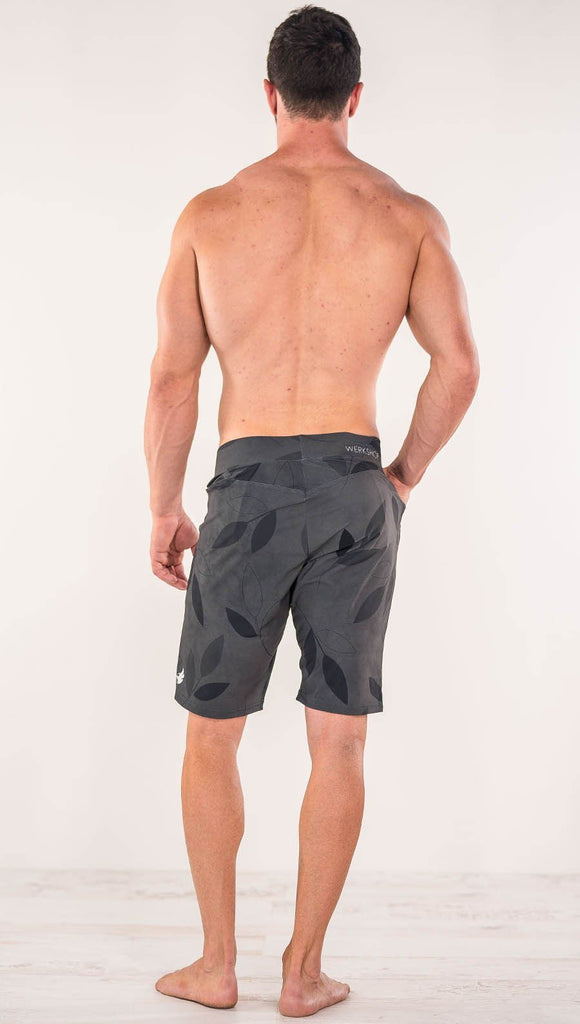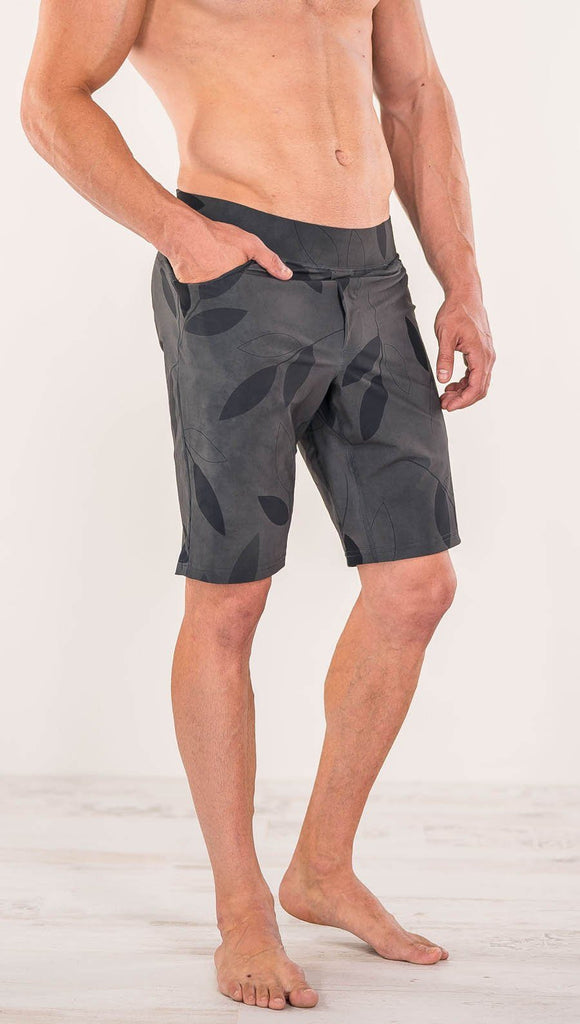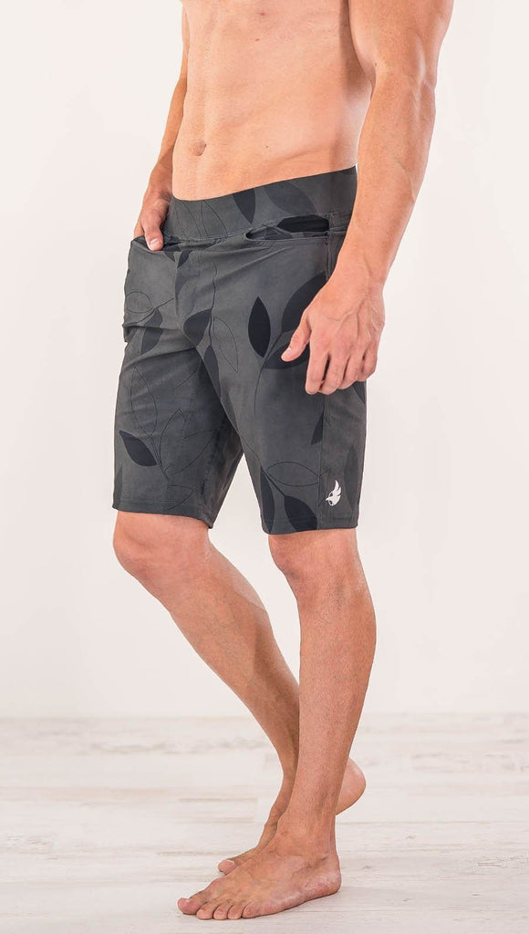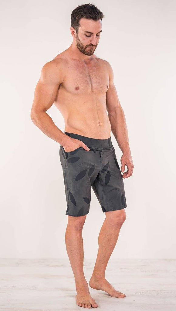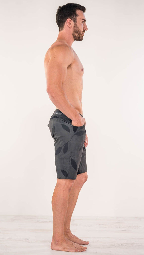 zoomed-in shot of our men's performance short fabric with gray palms artwork printed on it.